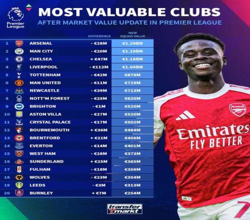 德转更新后英超俱乐部总身价排名: