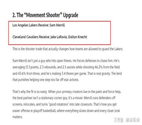 果然当地媒体又忍不住了,支招湖人交易来骑士后卫萨姆-梅里尔,这本身没啥问题,后者也确实可以帮到湖人。只不过从具体交易方案来看,湖人需要送走24岁前锋拉拉维亚,这就不是很明智了,替补射手道尔顿-克内克特则会当添头。