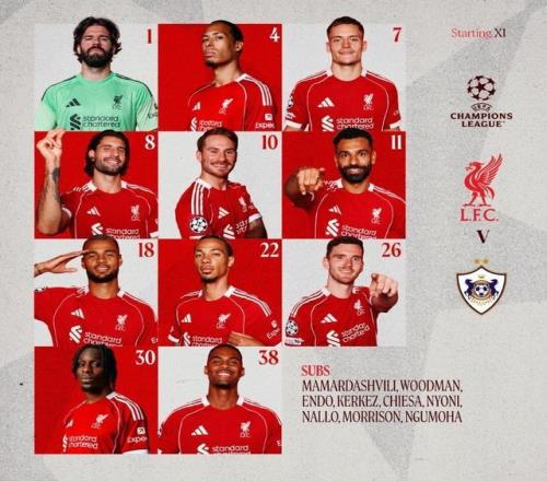 利物浦vs卡拉巴赫:萨拉赫、维尔茨首发,罗伯逊、加克波出战