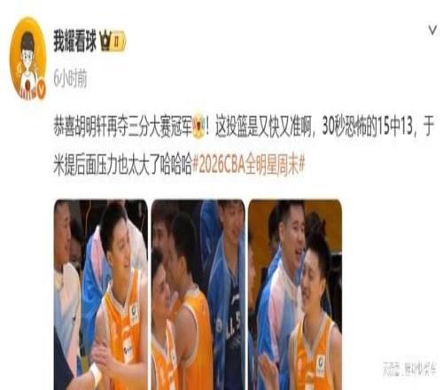这一次CBA全明星三分大赛,胡明轩的状态一直都非常不错。预赛阶段,他便投出了21分的不错分值。而在决赛阶段,作为第一个登场的球员,胡明轩的压力虽然比较大,不过,他还是顶住压力,成功投出了22分的高分。尽管于米提在随后也压哨绝杀,成功投出22分的高分。不过,在随后的加时阶段,胡明轩再度爆发,在短短30秒内,疯狂出手15次,命中13球,几乎完美的数据,轻松夺冠。