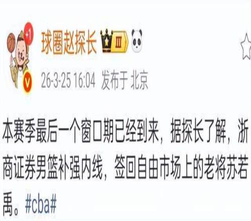 根据媒体人报道,CBA名将苏若禹确定会在这个窗口期加盟浙江广厦,他重返老东家效力,对于浙江广厦来说,这是一次非常好的补充,特别是5号位,以苏若禹的能力来说,还是会比吴骁要好一些,这也是一个信号,浙江广厦本赛季的目标就是全力卫冕总冠军。